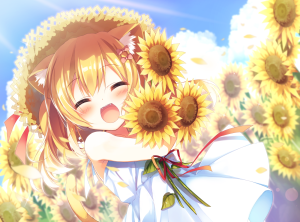 Konachan.com – 246093 amamine animal_ears blonde_hair blush bow catgirl clouds dress flowers hat loli original petals ribbons short_hair sky summer sunflower tail waifu2x 10.08.17 / mmandrakep
