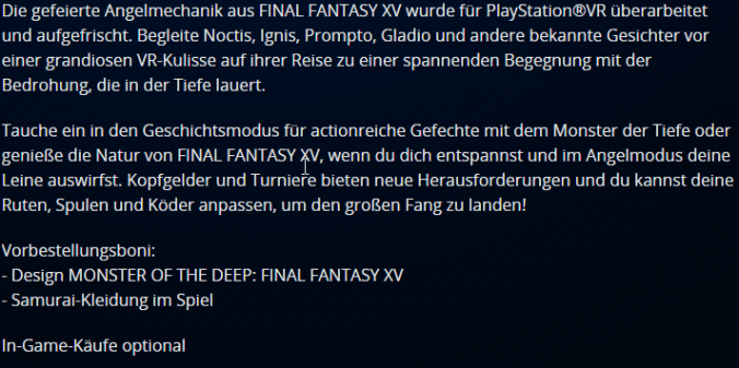 Und…ja, weil die Leute so nervig sind…die Switch kriegt auch unser downgraded FF15. Interessiert uns doch nicht. Was? VR? Ahm…oh ja. Da haben wir auch was!