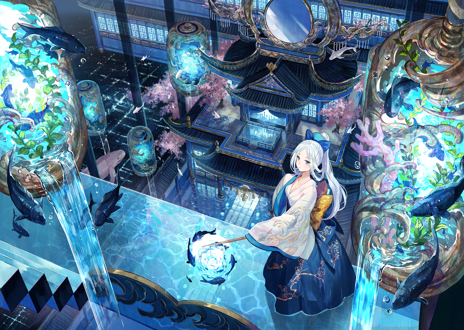 Konachan.com – 250360 animal aqua_eyes cherry_blossoms fish fuji_choko japanese_clothes long_hair original ponytail wand water waterfall white_hair 26.09.17 / mmandrakep