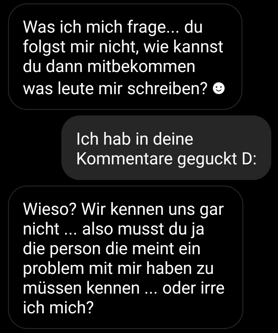 *Die Paranoia der Person im vollsten Ausmaße, natürlich schreibt man jemanden der fertig gemacht wurde an um zu spionieren, nicht weil man mitbekommt, dass jemand fertig gemacht wurde und wissen möchte was los ist und ob man irgendwie helfen kann.